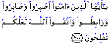 Allah directs believers to bear with their condition by way of creating an ambience of perseverance, urging one another to be patient. Another directive is to be firm in faith. This is rounded off with an exhortation of God-consciousness. The Arabic word sabr stands for constancy, consistency, an unwavering resolve and taking an uncompromising stand on one's principles. In the above passage believers are asked both to be patient and to act with perseverance. This should characterise community life. A believer's entire way of life, his conviction, his perseverance, his ambition and resolve, his excellent conduct and his behaviour should be such as to boost others' morale and be a guide for everyone. More importantly, we are instructed to stand firm in our faith. The Quran uses the expression ribat which refers to a safe habitation. Believers are exhorted to live together in unity, giving the ambience of an invincible fortress to the enemy. What follows this is the best piece of advice one can obtain: "Fear Allah". Source: |