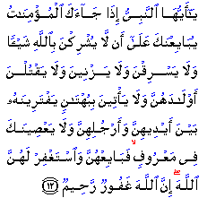 "O Prophet! When believing women come to thee to take the oath of allegiance to thee, that they will not associate in worship any other thing whatever with Allah, that they will not steal, that they will not commit adultery (or fornication), that they will not kill their children, that they will not utter slander, intentionally forging falsehood, and that they will not disobey thee in any just matter; then do thou accept their allegiance, and pray to Allah for the forgiveness (of their sins): for Allah is Oft-Forgiving, Most Merciful."
