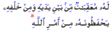 The allusion here is to the guardian angels attached to every soul guarding him or her from harm unless Allah wills otherwise. According to a Hadith in Abu Dawud, these angels guard man from falling into potholes, slip down from top of walls, escape flying objects, etc., unless Allah wills otherwise. When Allah wills, the angels move away. Life would be impossible if Allah removed these angels. One of the angels is positioned at the front while the other at the rear. They change their duties morning and evening. There are two others, one at the right hand side and another at the left. These two write down the deeds. The one on the right records good deeds while the other at left records evil deeds. Thus, every man has four angels with him at any time: four during the day, and four others at night (Bukhari). The angels are with us all the time except when we are having intercourse and we are in the washroom. (Ibn Kathir) But Allah's protection should not lead the people to believe that they can do what they wish. Rather, although it is true that Allah does not punish for no crime, when we rebel, the protection is withdrawn. Not even the guardian angels can do anything for us in that event. Source: |