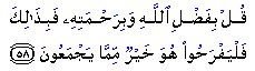 Ibn Abbas, Mujahid and Hasan have said that the words "bounty," and "mercy" allude to Islam and Quran (Ibn Jarir). Ibn Kathir adds: When the Iraqi tribute arrived at Madinah Umar came out counting the camels, but gave up because of the huge numbers. One of his slaves remarked, "This is by Allah's bounty and mercy." Umar reacted, "You have lied. Allah has said in reference to the Revelation, "Say: "In the Bounty of Allah. And in His Mercy, in that let them rejoice": that is better than the (wealth) they hoard." Rather, this is what they (the people like to) amass." The textual term for rejoice, "farh" is used for over-joyousness and is normally disapproved of. It also bears an element of boastfulness. Nonetheless, here, the blessing of the Quran and Islam is so great that the faithful might indulge in over-joyousness. Source: |