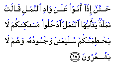 Then, when they reached the valley of the ants, an ant said, 'Ants! Enter your dwellings so that Sulayman and his troops do not crush you unwittingly.'