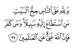 "Pilgrimage to this house is a duty owed to God by all people who are able to undertake it. As for those who disbelieve, God does not stand in need of anything in all the worlds."