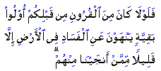 "Why were there not among the generations before you owners of wisdom restraining others from corruption on the earth, except a few of those whom We delivered from among them?"