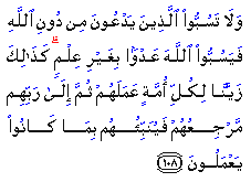 "And insult not those whom they (disbelievers) worship besides God, lest they insult God wrongfully without knowledge. Thus We have made fair-seeming to each people its own doings; then to their Lord is their return and He shall then inform them of all that they used to do."