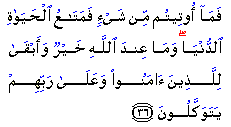 "What you are given (here) is a provision for the life of this world and what is with Allah is better and more lasting for those who believe, and who put their trust in their Lord."