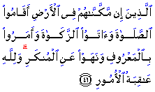 These are the characteristics of those who help God and who are deserving of God's aid and support. When power is bestowed on them, rather than being like those who engage in evil deeds and who strut about arrogantly exulting in their power, such people concern themselves with such noble tasks like establishing Prayer. Likewise, rather than squandering their wealth on luxury and self-indulgence, they use it in the way of Zakah. Again, they use their power to promote goodness and to remove evil.