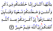 "O Mankind, We created you from a single (pair) of a male and a female and made you into nations and tribes, that you may know each other. Verily the most honoured of you in the sight of God is he who is the most righteous of you"
