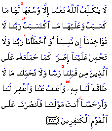 “On no soul does Allah place a burden greater than it can bear. It gets every good that it earns, and it suffers every ill that it earns. (Pray:) 'Our Lord! Condemn us not if we forget or fall into error; our Lord! Lay not on us a burden like that which You did lay on those before us; our Lord! lay not on us a burden greater than we have strength to bear. Blot out our sins, and grant us forgiveness. Have mercy on us. You are our Protector; help us against those who stand against Faith.'”
