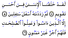 "We indeed have created man in the fairest form. Then We brought him down to the lowest of the low, except for those who believe and do righteous deeds for theirs shall be an unfailing recompense."