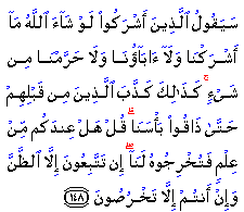 "Those who associate others with Allah in His divinity will now surely say: 'Had Allah willed, neither we nor our forefathers would have associated others with Allah in His divinity, nor would we have declared anything (which Allah did not forbid) as forbidden.' Even so those who had lived before them gave the lie (to the Truth) until they tasted Our chastisement. Tell them: 'Have you any sure knowledge that you can produce before us? In fact you are only following idle fancies, merely conjecturing.'"