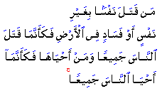 "he who slays a soul unless it be (in punishment) for murder or for spreading mischief on earth shall be as if he had slain all mankind; and he who saves a life shall be as if he had given life to all mankind."