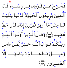 "And so he (Qarun) went before his people in all his pomp. Those who cared only for the life of this world said: 'Oh, would that we had the like of what Qarun has been given! He is certainly a man of great fortune!' But those who had been granted true knowledge said: 'Woe to you! God's reward is by far the best for any who believes and does what is right. Yet none can attain this other than those who are patient in adversity.'"