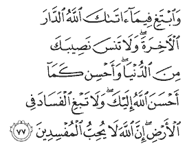 "Seek, by means of what Allah has granted you, the life to come, and forget not your share of the present world; and do good as Allah has done good to you; and seek not to spread corruption on earth. Indeed, Allah does not like corrupters."