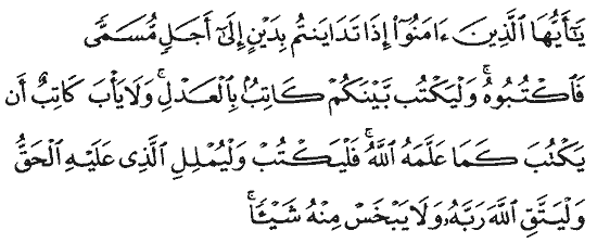 "Believers! Whenever you contract a debt from one another for a known term, commit it to writing. Let a scribe write it down between you justly, and the scribe may not refuse to write it down according to what Allah has taught him; so let him write, and let the debtor dictate; and let him fear Allah, his Lord, and curtail no part of it..."