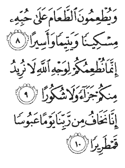 "Who give food - though they need it themselves - to the needy, the orphan and the captive, [saying within themselves,] 'We feed you for the sake of God alone. We desire neither recompense from you, nor thanks. We fear the day of our Lord: a bleak, distressful day.'"