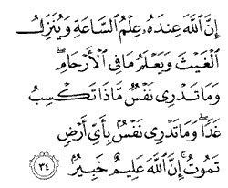 "Indeed, Allah alone has knowledge of the Hour and sends down the rain and knows what is in the wombs. And no soul perceives what it will earn tomorrow, and no soul perceives in what land it will die. Indeed, Allah is Knowing and Acquainted."