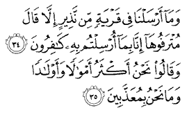 "Whenever We sent a warner, the affluent in the community would say, 'We refuse to believe in what is sent with you; we have greater wealth and more offspring, and we shall not be punished.'"