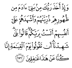 And [mention] when your Lord took from the children of Adam - from their loins - their descendants and made them testify of themselves, [saying to them], "Am I not your Lord?" They said, "Yes, we have testified." [This] - lest you should say on the day of Resurrection, "Indeed, we were of this unaware."