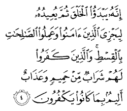 "He originates all His creation, and then brings them all back to life so that He may reward, with equity, those who have believed and done good deeds. As for the unbelievers, they shall have a scalding drink and a grievous suffering for their unbelief."
