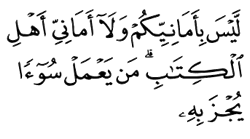 The Quran accordingly rules out any partisanship. A pointed reference is made to false, whimsical notions entertained by the People of the Book. This address is also directed at the Prophet's Companions, including those who had participated in the Battle of Badr and the Hudaybiyyah Treaty. Among them were such noble who had been promised entry into Paradise in their own lifetime. They are told curtly that their wishes will not tilt the balance in their favour.